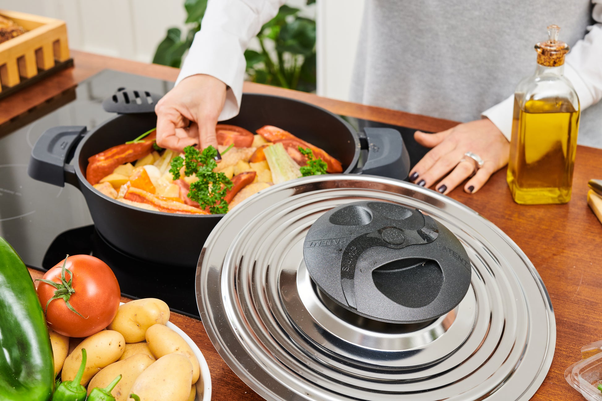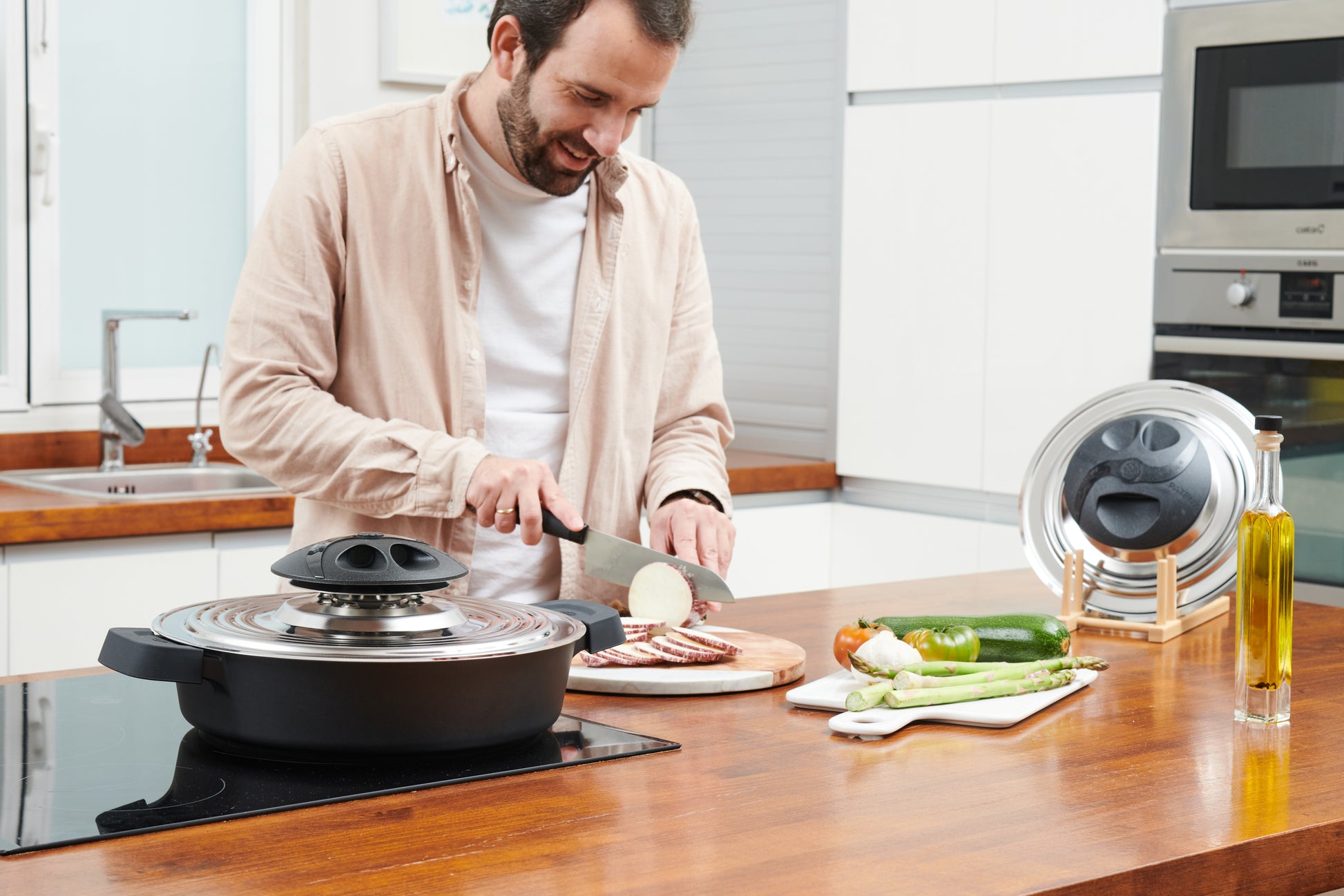 Fondo difusor Full Induction apto para todo tipo de fuentes de calor: fuego, vitrocerámica, inducción, etc. Su cuerpo interno de aluminio fundido favorece la difusión homogénea y rápida del calor. Ahorras tiempo mientras te garantiza los mejores resultados.